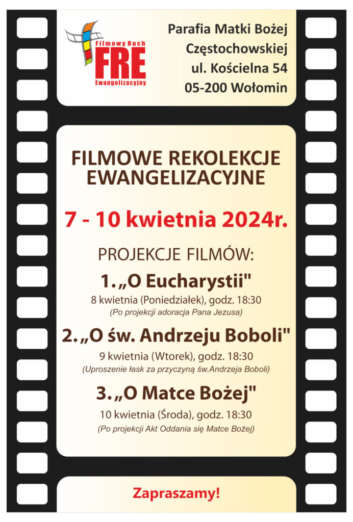 Zapraszamy na: FILMOWE REKOLEKCJE EWANGELIZACYJNE Parafia Matki Bożej Częstochowskiej ul. Kościelna 54, 05-200 Wołomin W tym czasie odbędą się projekcje…...
