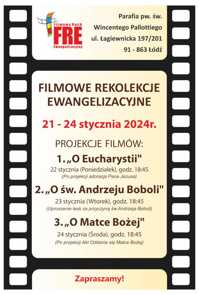 Zapraszamy na: FILMOWE REKOLEKCJE EWANGELIZACYJNE Parafia pw. św. Wincentego Pallottiego SANKTUARIUM ŚWIĘTOŚCI ŻYCIA ul. Łagiewnicka 197/201 91-863 Łódź W tym…...
