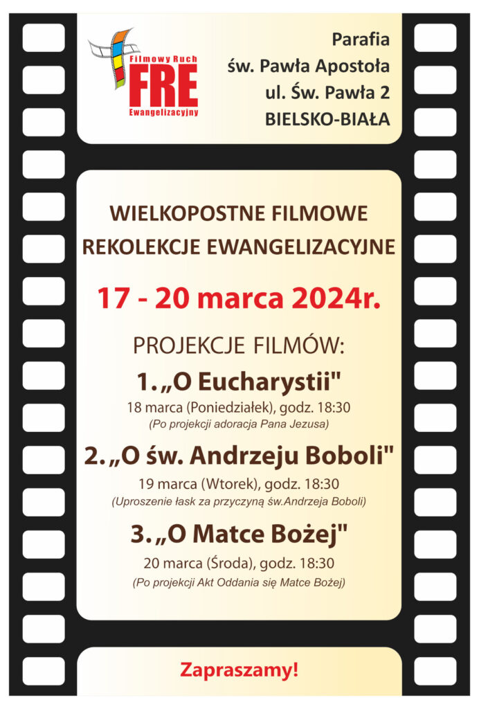 Zapraszamy na: WIELKOPOSTNE FILMOWE REKOLEKCJE EWANGELIZACYJNE Kościół pw. Św. Pawła Apostoła ul. Św.Pawła 2 43-300 Bielsko-Biała W tym czasie odbędą…...